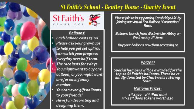 Welcome to St Faith’s first ever Virtual Balloon Race – we’d love you to take part in our Bentley House Charity fundraising event this year, in support of Cambridge Aid! This is virtual, so totally environmentally friendly and there is no risk to wildlife!!!