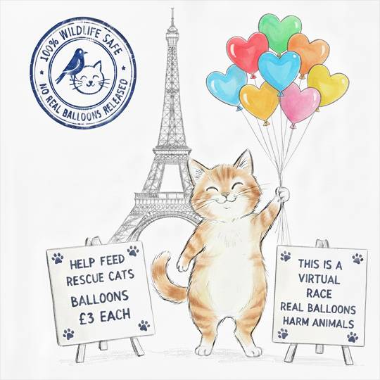 Please buy balloons today, whether for yourself, for a friend or loved one, or in memory of someone special, as this will help us feed the rescue cats in our care. Thank you and happy racing!