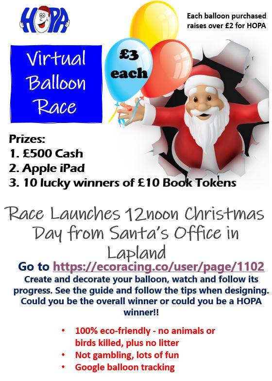 Be part of the big Christmas Day Balloon Race - buy a balloon, create and decorate your balloon and then track it. Will it go all the way, where will it reach, will it pop!! HOPA receives over £2 for each balloon purchased.