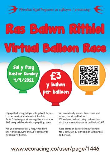 Rhannwch, cymerwch ran a chefnogwch drwy gofrestru yma: https://ecoracing.co/user/page/1446 neu sganiwch y Cod QR ar y posteri, a chliciwch ar y blwch glas i ‘brynu balwnau personol’. Rhaid prynu y balwn erbyn 3ydd Ebrill.