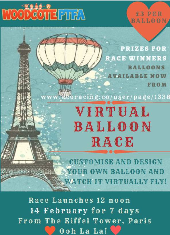 As you are aware, Woodcote Primary is developing their garden area on the upper KS2 playground for all years to benefit from in the future. They have started to clear this area and have been collating ideas for what may be placed there. Woodcote PTFA plans to donate around £6000+ to school for its redevelopment. All funds raised with the Virtual Ballon Race on Valentine's Day will go towards this cause, as part of a series of fund raising events we are doing to raise these funds for the school. We would like to encourage as many members of your household to take part and, of course, you could purchase more than one balloon each. Why not purchase a Valentine balloon for a love one as a present? (they get given a code to track it).